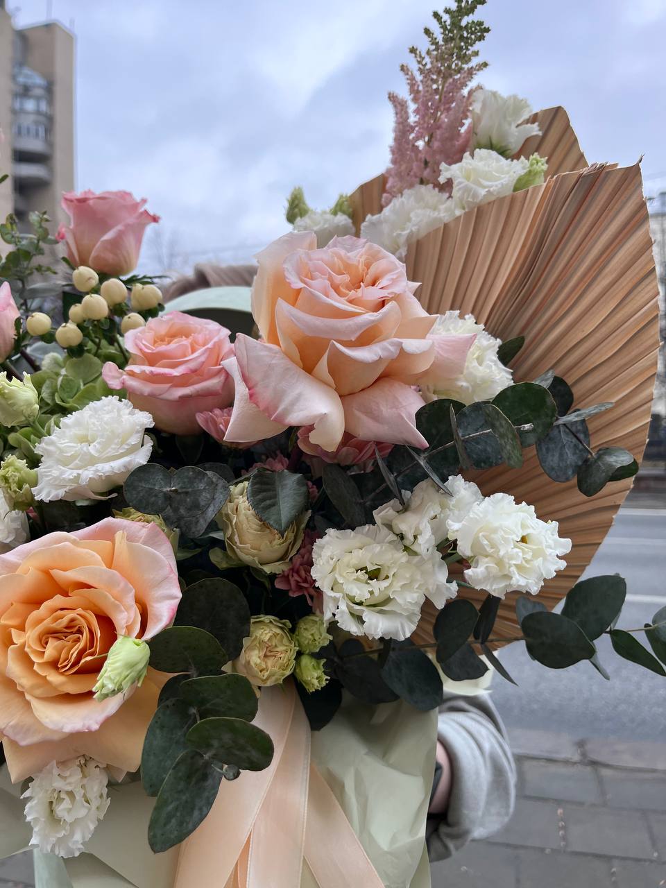 Данная цветочная композиция под запрос. Это значит что возможно у нас отсутствует какой-либо цветок в составе букета. Но мы готовы собрать похожую композицию, не чуть не менее красивую чем эта. Вы можете оставить заявку. И мы свяжемся с вами и предложим возможные варианты.