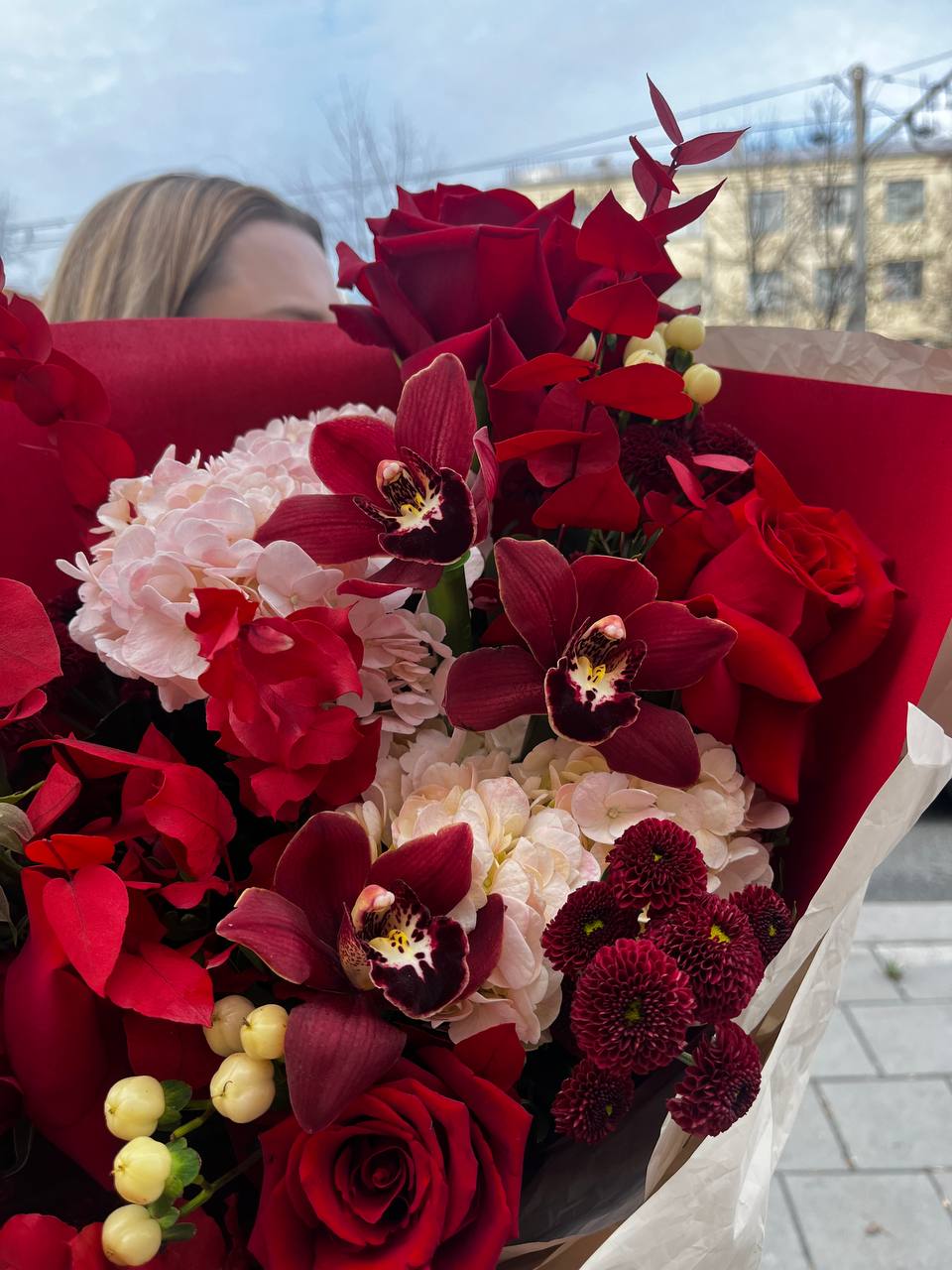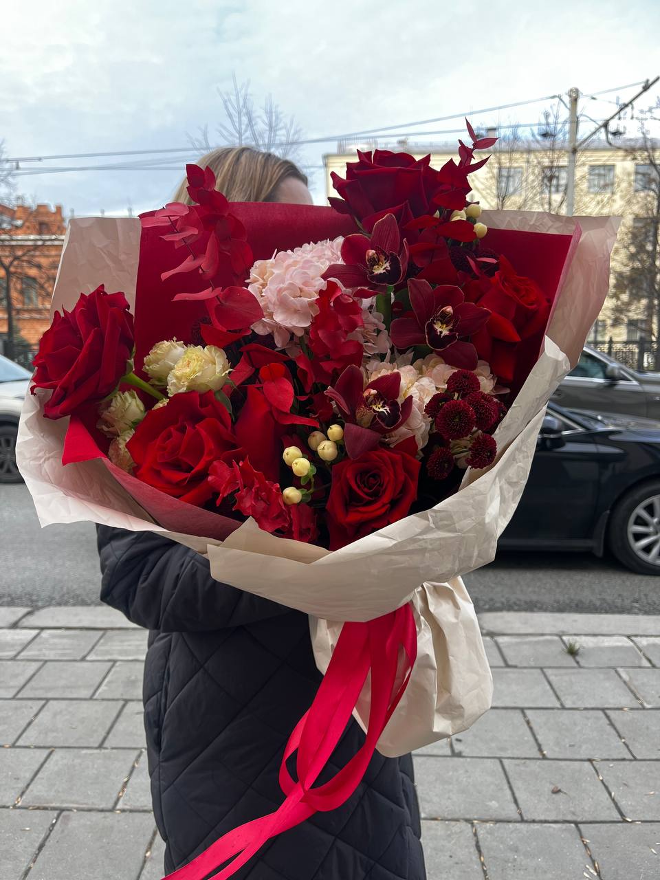 Данная цветочная композиция под запрос. Это значит что возможно у нас отсутствует какой-либо цветок в составе букета. Но мы готовы собрать похожую композицию, не чуть не менее красивую чем эта. Вы можете оставить заявку. И мы свяжемся с вами и предложим возможные варианты.