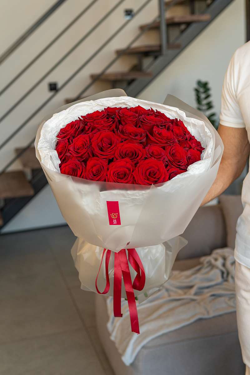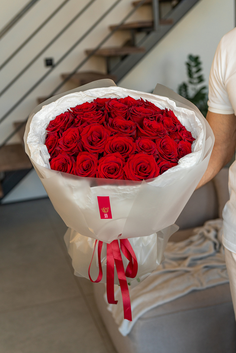 Роскошный букет из 25 красных роз — это яркое, бескомпромиссное признание в чувствах. Каждая роза в композиции подобна пылающему угольку, складывающемуся в единый огонь страсти и преданности. Этот букет не оставляет места для сомнений: он говорит о глубокой, зрелой любви и восхищении.