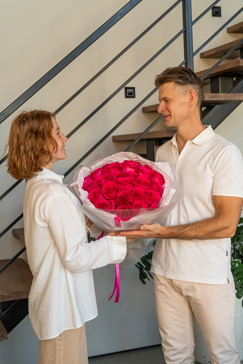 Яркий, завораживающий букет из 25 фуксийных роз — это энергичное признание в чувствах, где каждый цветок словно излучает страсть, радость и восхищение. Насыщенный фуксийный оттенок — смелый выбор для тех, кто хочет заявить о своих эмоциях.