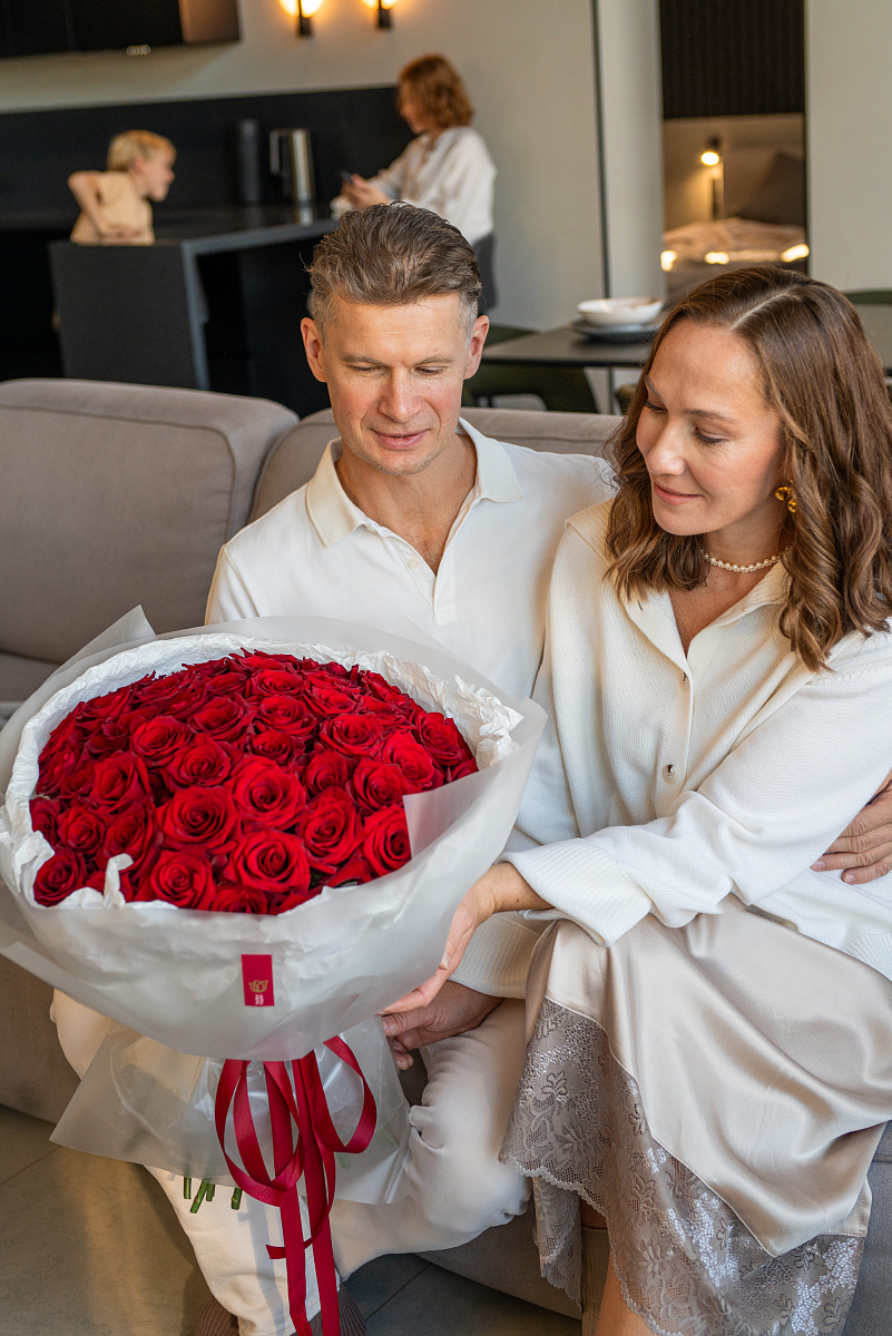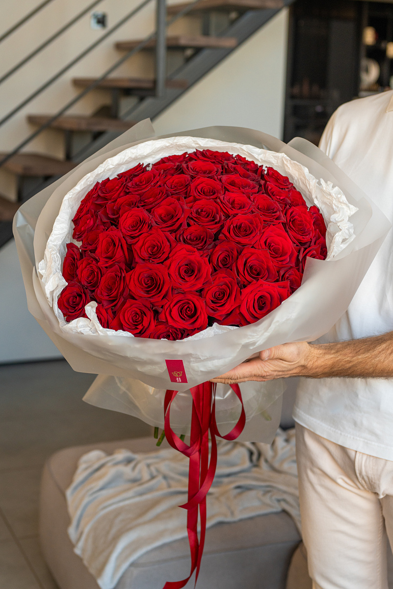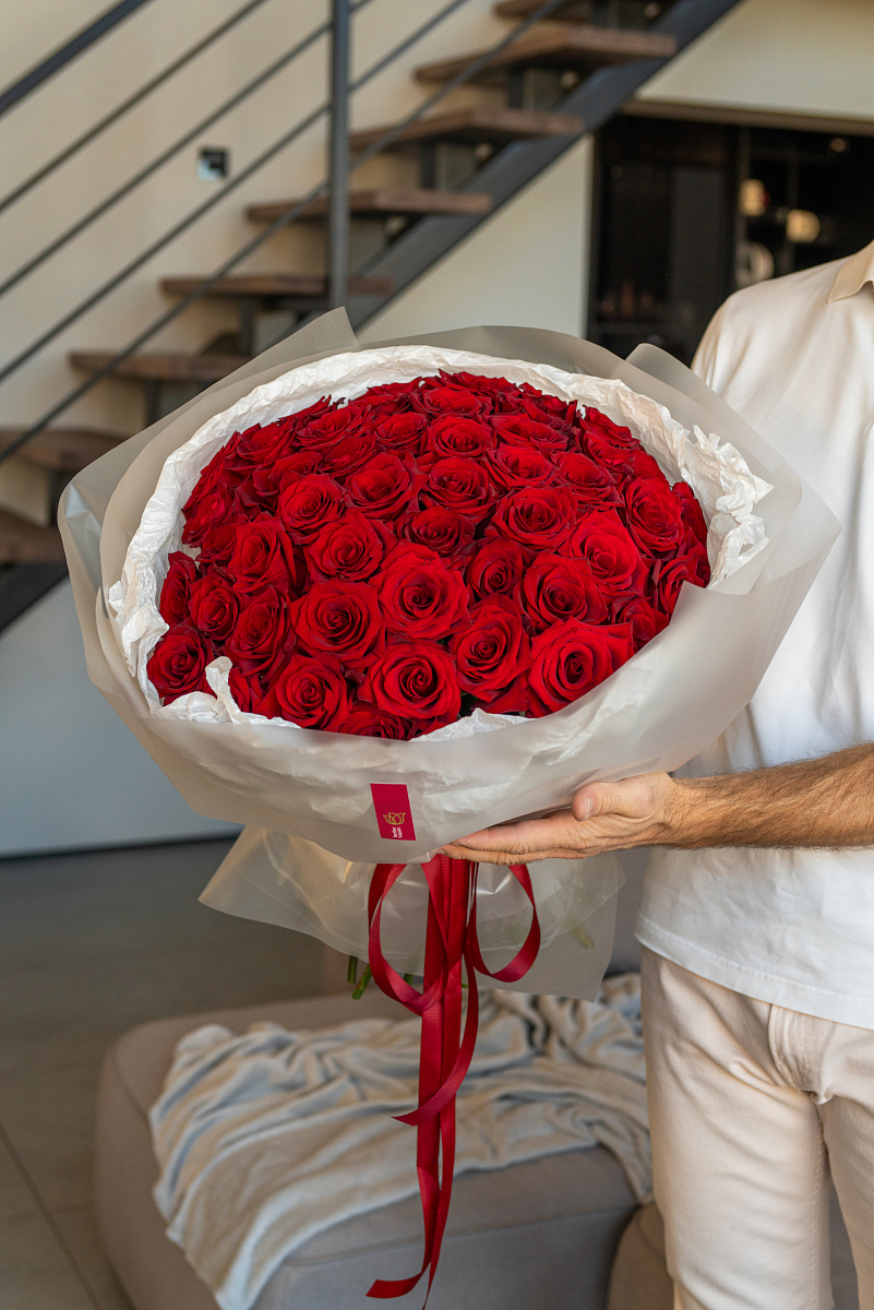 Роскошный букет из 51 красной розы — это яркое, бескомпромиссное признание в чувствах. Каждая роза в композиции подобна пылающему угольку, складывающемуся в единый огонь страсти и преданности. Этот букет не оставляет места для сомнений: он говорит о глубокой, зрелой любви и восхищении.