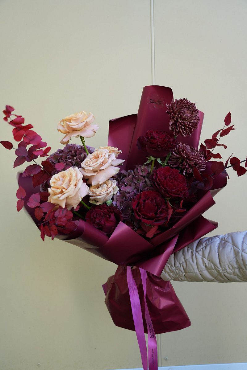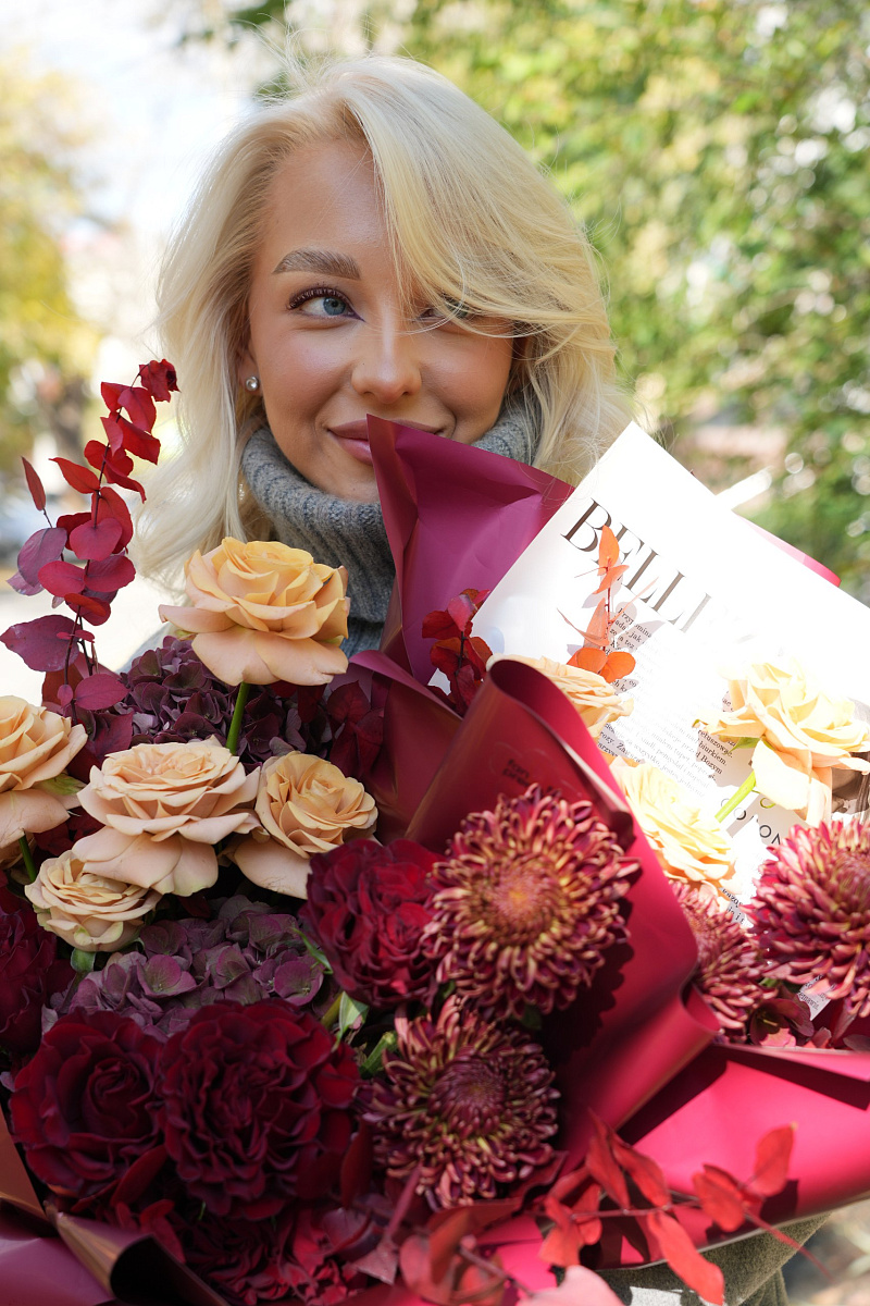 Авторский букет «Изабелла» представляет собой изысканное сочетание цветов и декоративных элементов, создающее неповторимую атмосферу элегантности и утонченности.