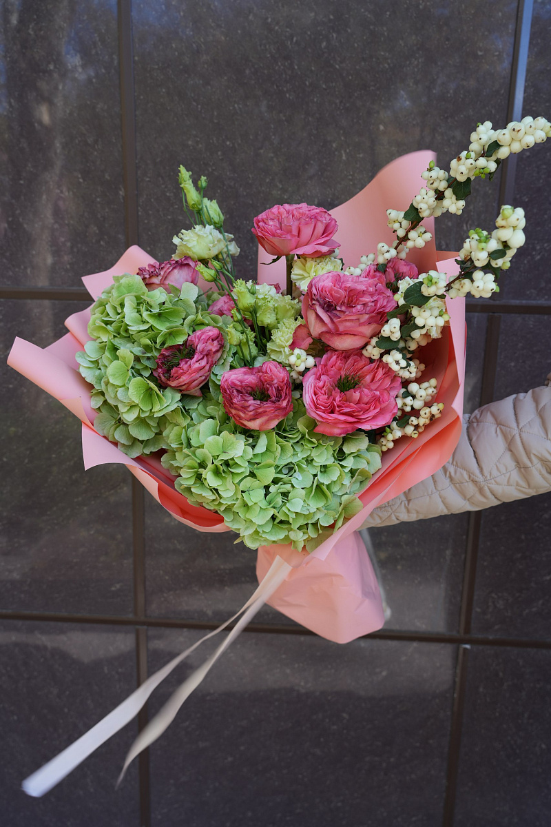 Букеты с зеленой гортензией и розовыми розами представляют собой гармоничное сочетание ярких красок и элегантности. Они привлекают внимание своим уникальным внешним видом и являются отличным выбором для различных мероприятий, включая свадьбы, дни рождения и романтические встречи.