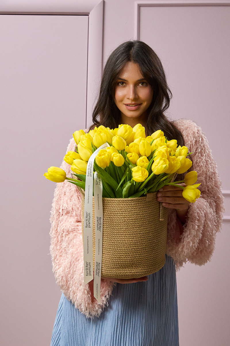 Кашпо плетеное с желтыми тюльпанами