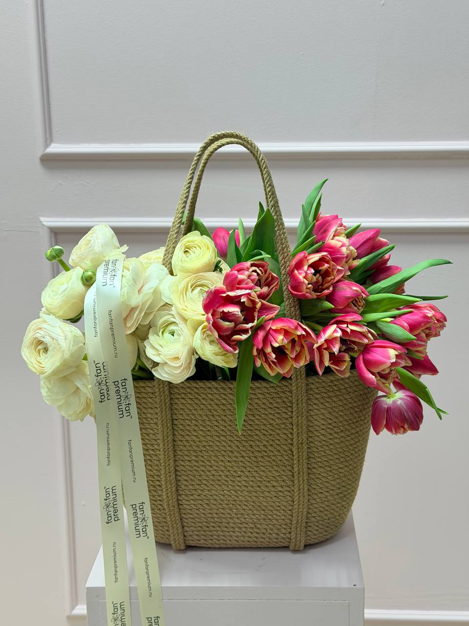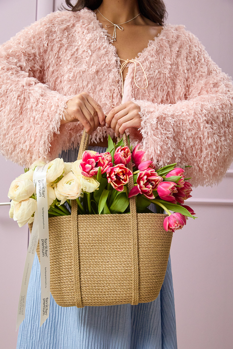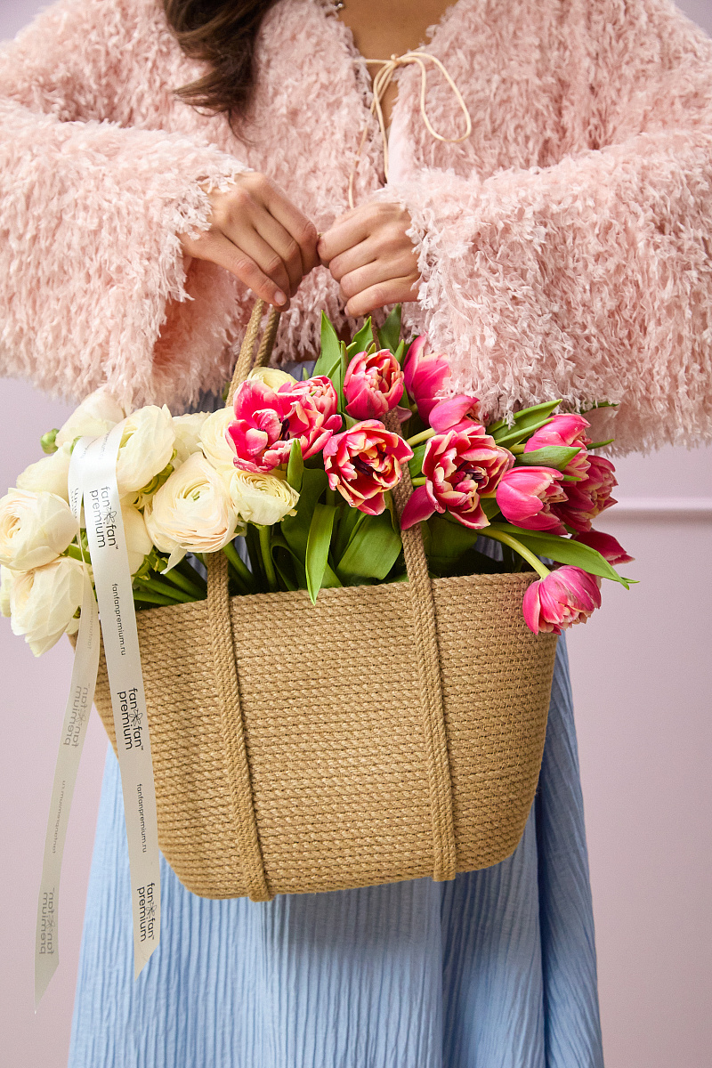 Композиция выглядит свежо и жизнерадостно, идеально подойдёт для весеннего декора, подарка или украшения интерьера. Сочетание натурального кашпо и нежных ранункулюсов создаёт гармоничный и стильный акцент.