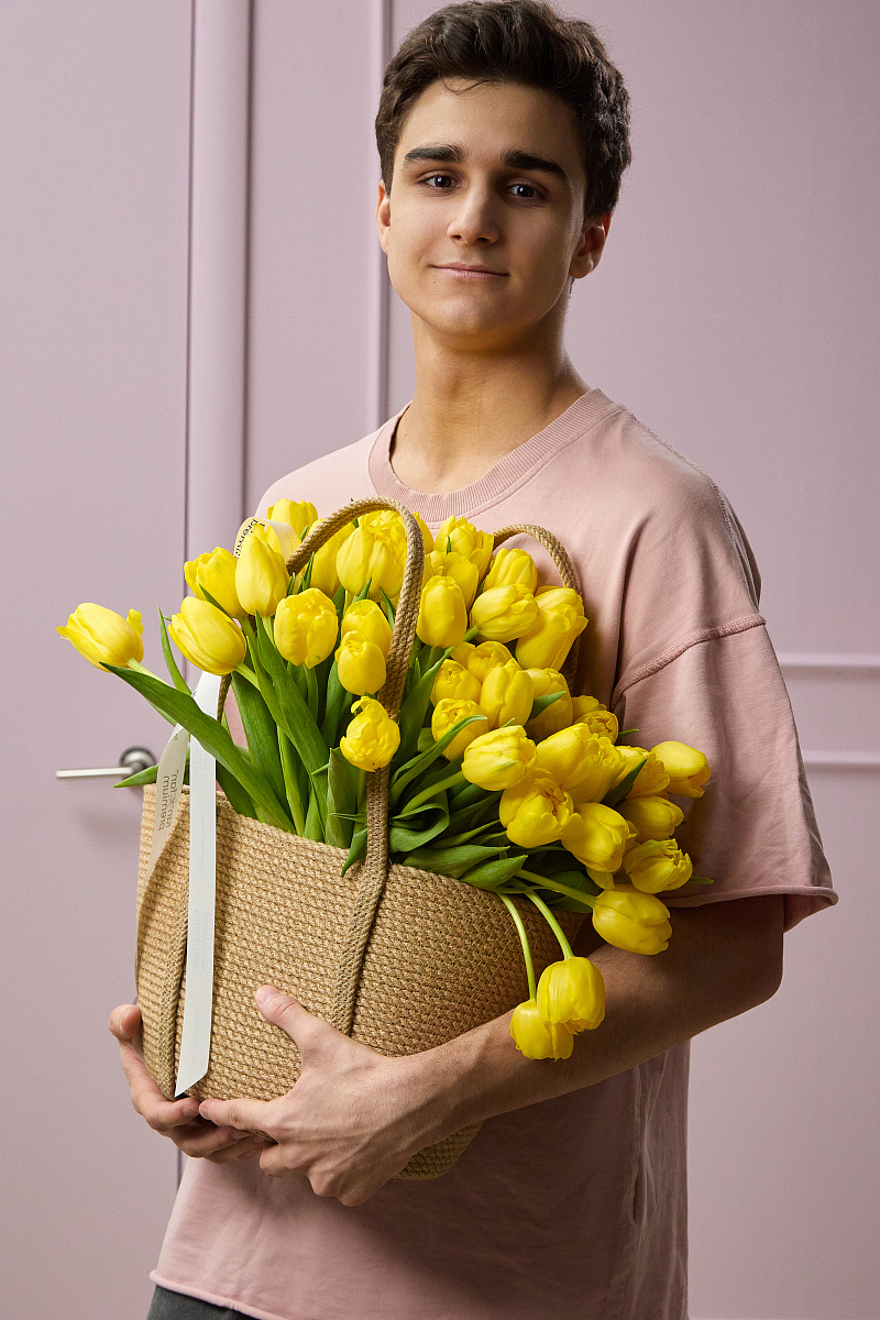 Композиция выглядит свежо и жизнерадостно, идеально подойдёт для весеннего декора, подарка или украшения интерьера. Сочетание натурального кашпо и ярких тюльпанов создаёт гармоничный и стильный акцент.