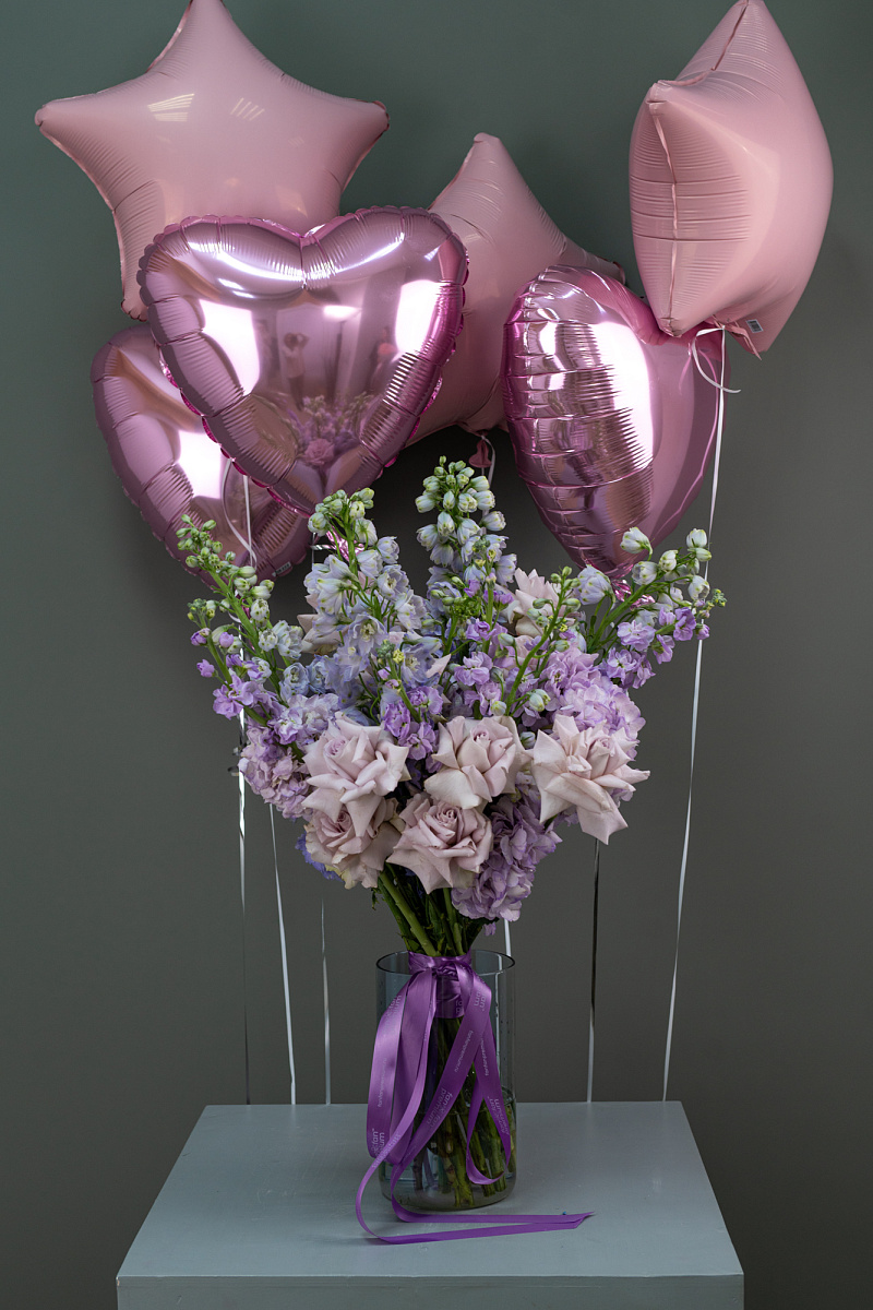 Букет из свежих цветов передаёт глубину эмоций, а воздушные шары добавляют волшебства, словно поднимая сердце к небесам. Подарите момент, когда любовь становится осязаемой.