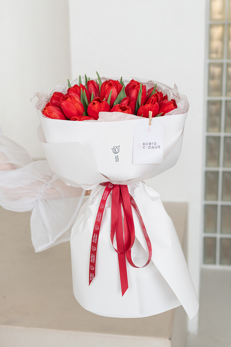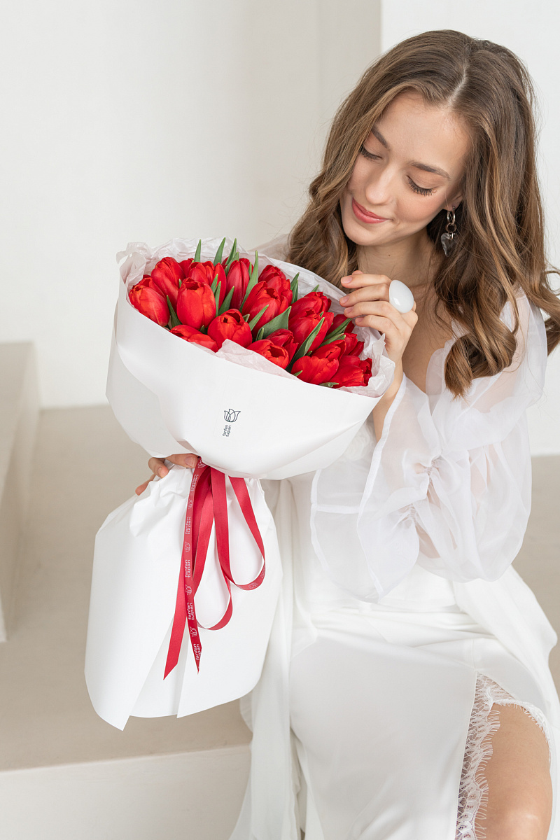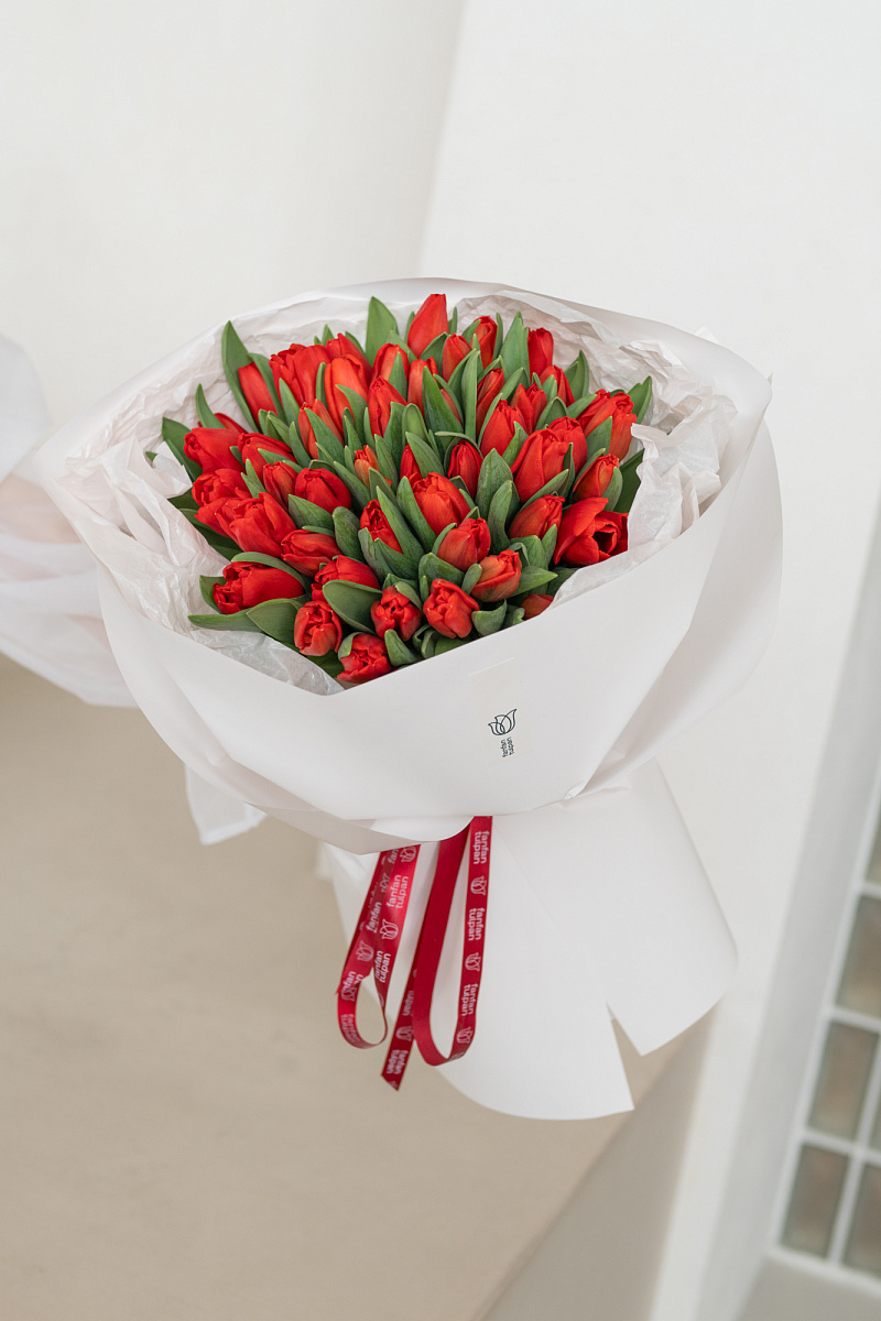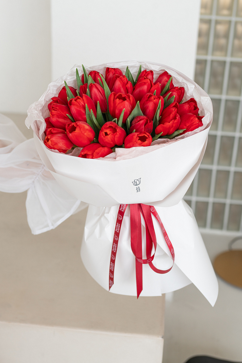 Монобукет из красных тюльпанов — воплощение страсти и элегантности. Строгая композиция с акцентом на насыщенный оттенок создаёт выразительный образ. Подходит тем, кто ценит силу цвета и лаконичность форм.