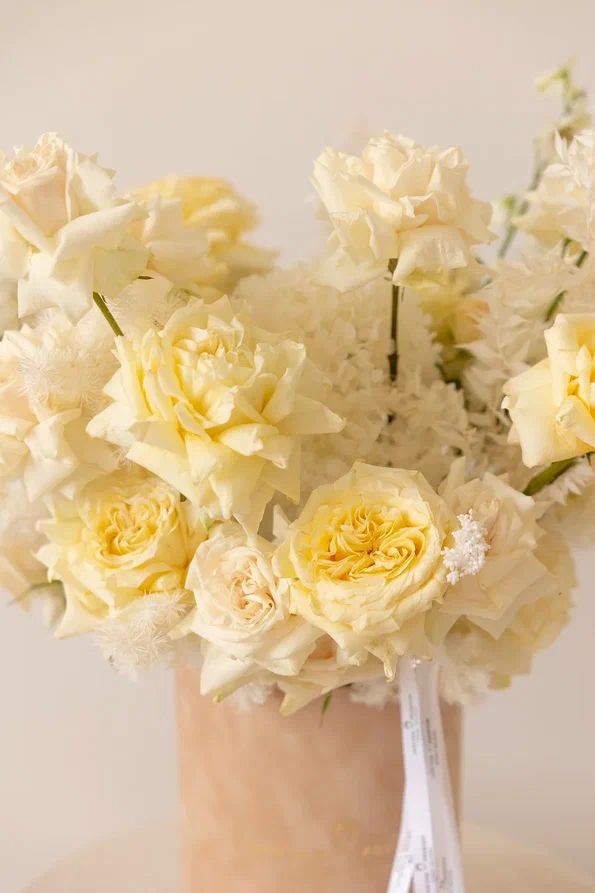 Роза кустовая ,Розы ,Дельфиниум ,Гортензия стабилизированная ,Рускус стабилизированный