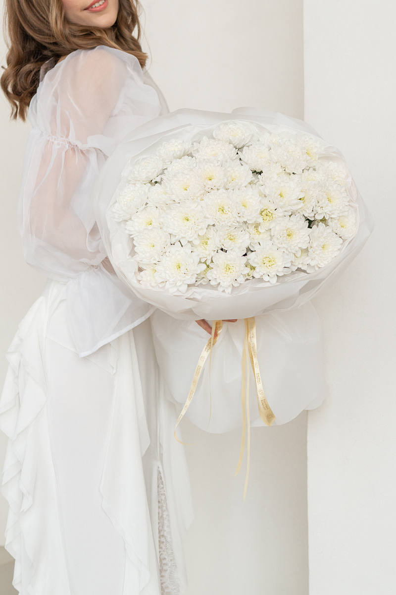 Букет из белых хризантем — как несказанное признание в искренних чувствах. Каждый цветок словно шепчет о чистоте помыслов и глубине эмоций. Подарите этот символ нежности тому, кто занимает особое место в вашем сердце.