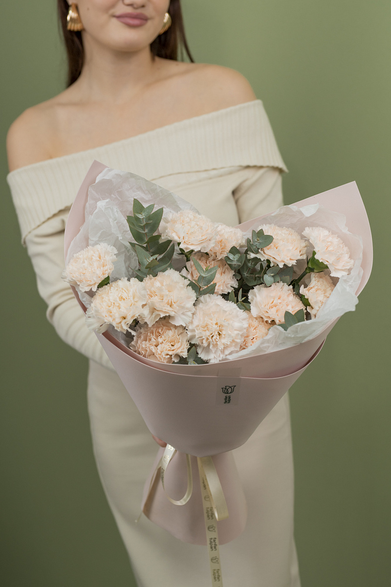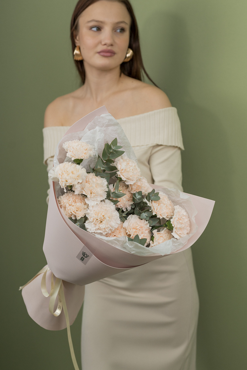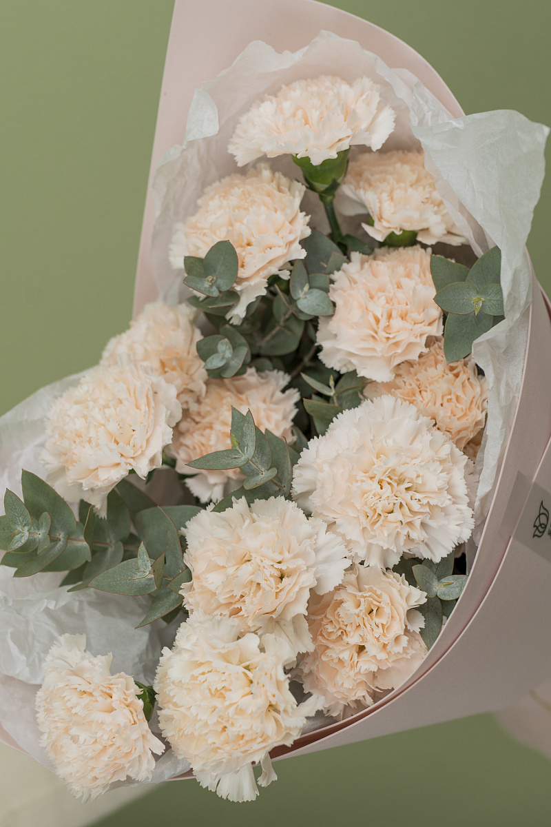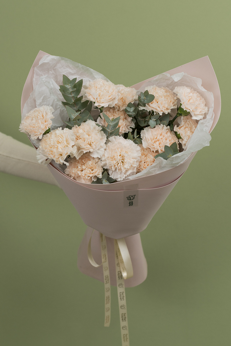Волшебная композиция, созданная из нежных гвоздик ,словно россыпь сладких карамелек, притягивает взгляды и завораживает сердца. Этот неповторимый букет, воплощение жизнерадостности и тепла, наполняет пространство сладковатыми ароматами и подарит бесконечное настроение радости.Каждая гвоздика словно плод тайного сотрудничества солнечных лучей и ласкового дождя, что делает их еще более яркими и пленительными.