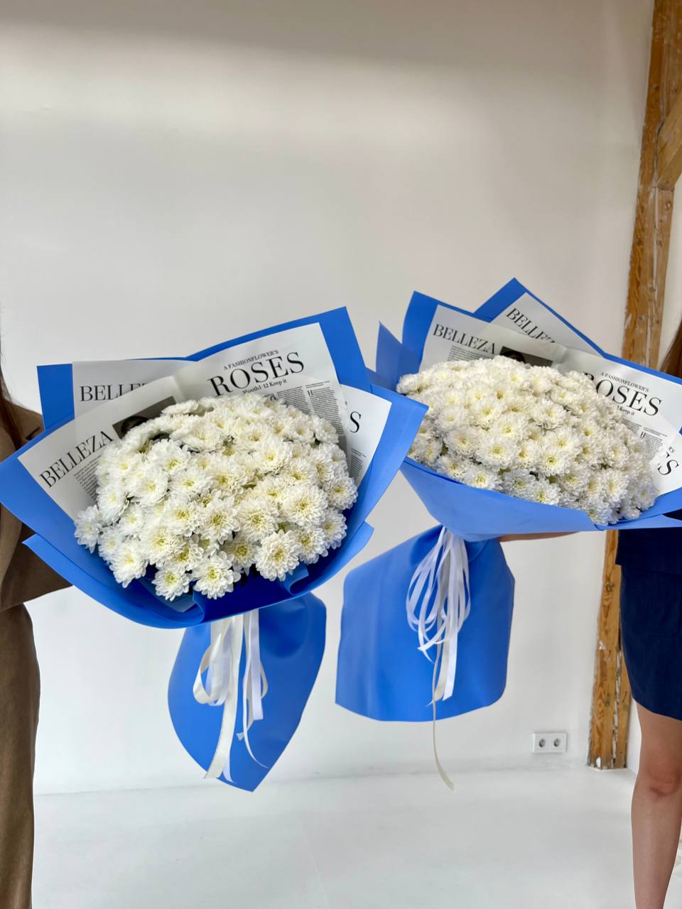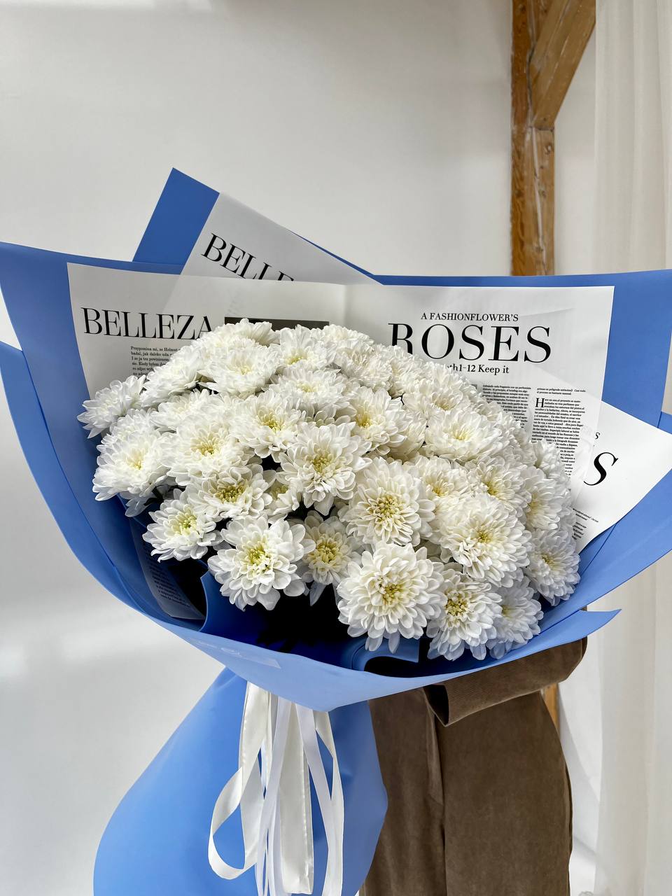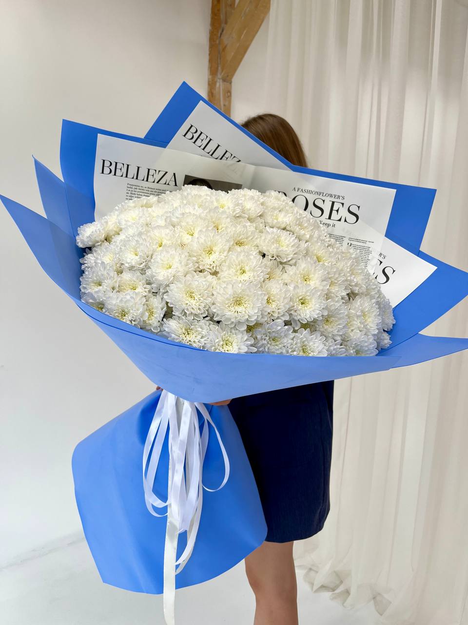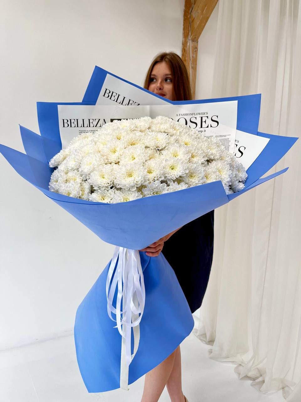 Большой букет из белых хризантем смотрится роскошно и торжественно. Белый цвет ассоциируется с чистотой, искренностью и благородством, делая такой подарок идеальным выбором для выражения уважения, благодарности или глубокого чувства симпатии.