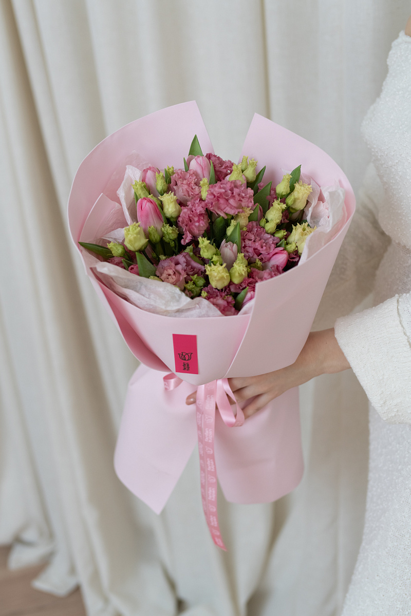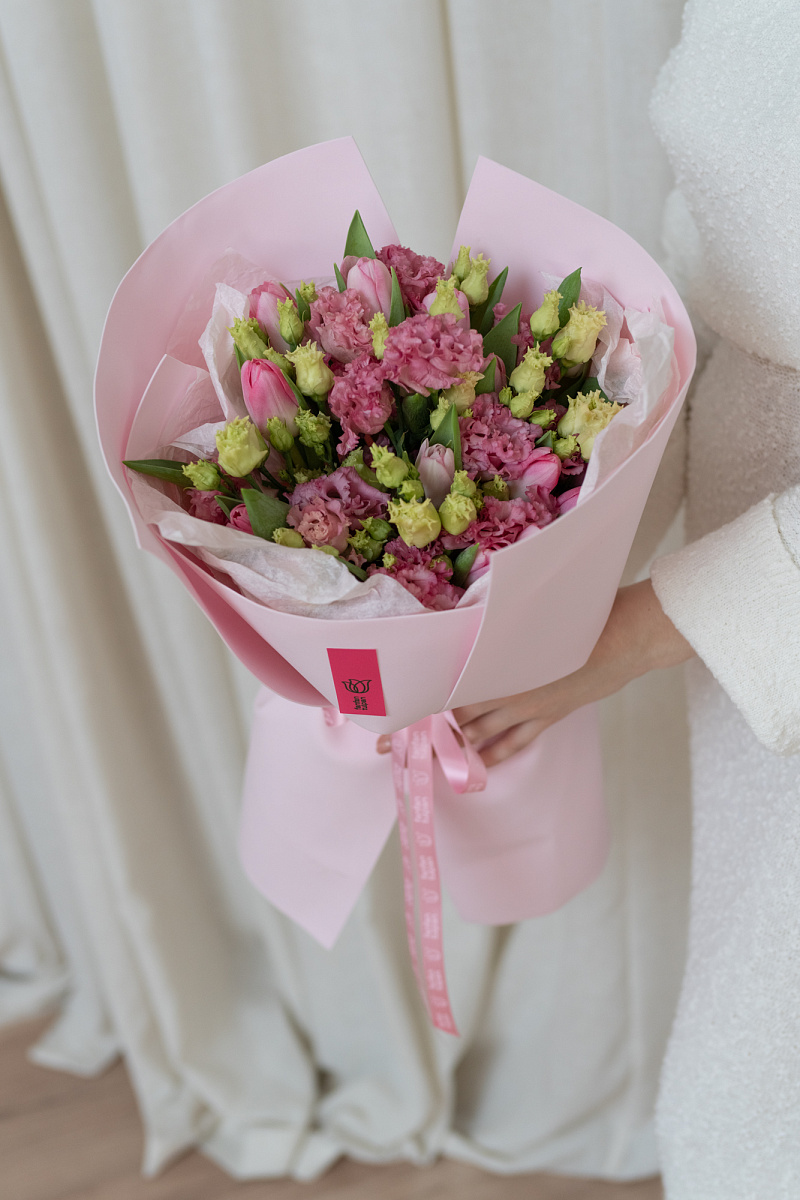 Букет из розовых тюльпанов и эустом Трепет счастья