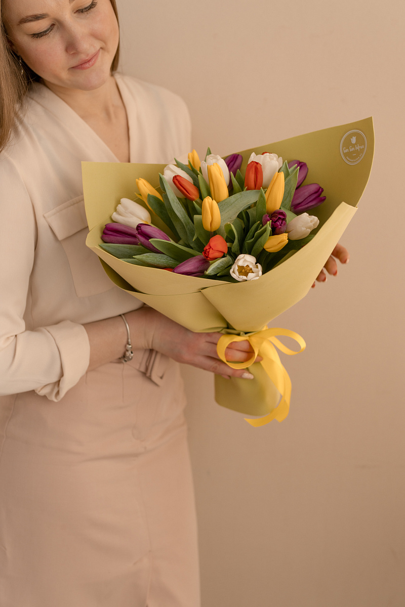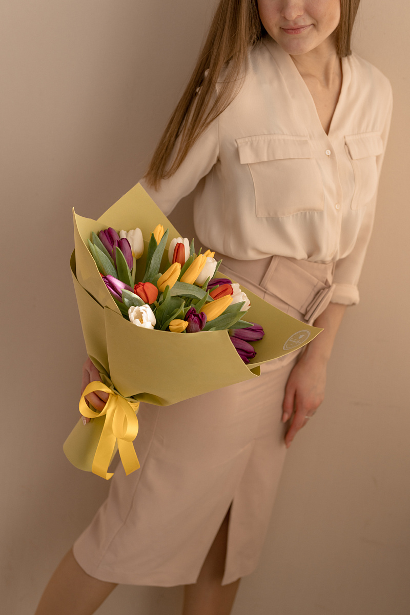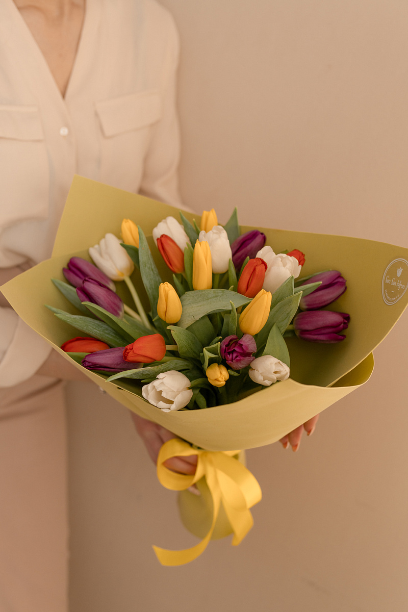 Тюльпаны — это и символ весны, и проявление бесконечной красоты природы. Их нежные лепестки, испускающие легкий аромат, завораживают своей простотой и изысканностью одновременно. И вот, когда ты видишь целый букет из тюльпанов перед собой, то понимаешь, что это произведение искусства, созданное руками талантливых флористов.