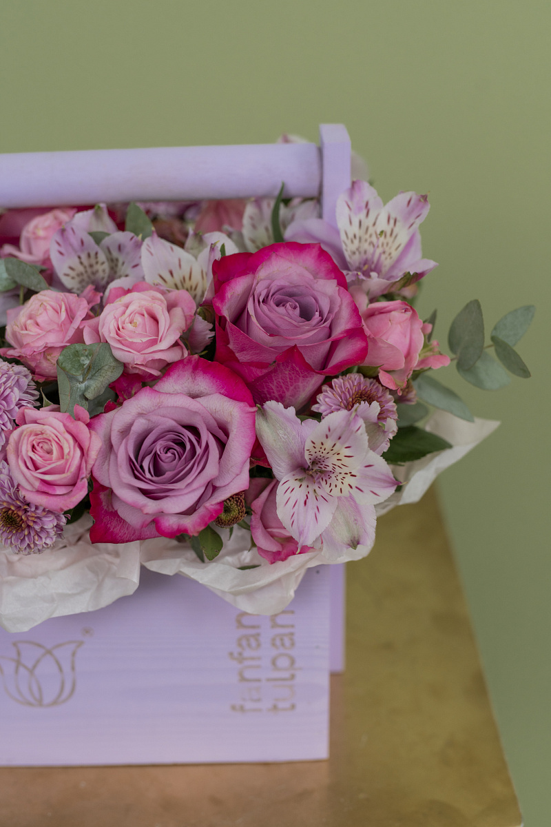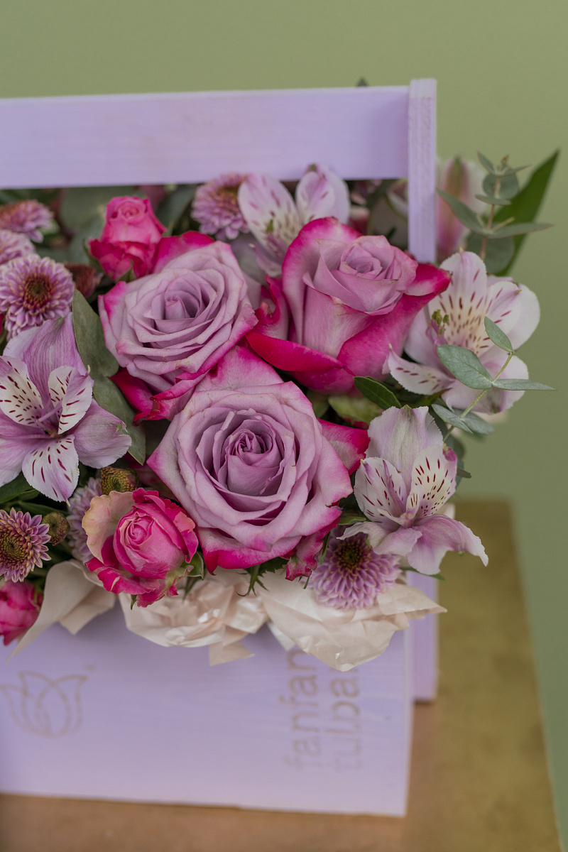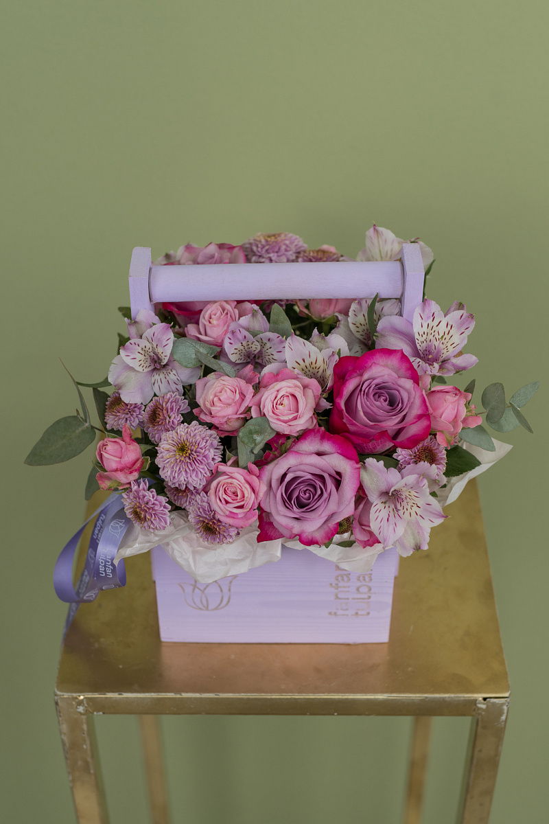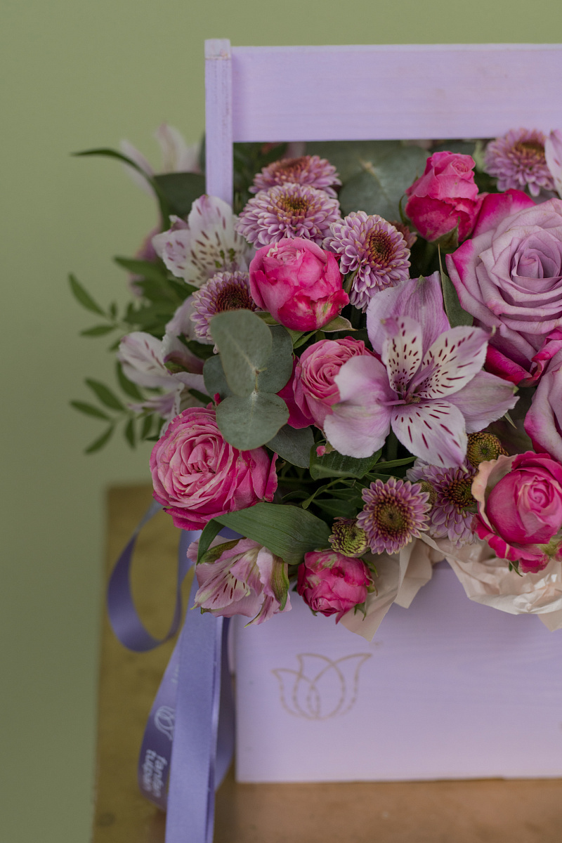 Композиция включает в себя красивые лиловые розы deep purple, которые придают ему загадочности и изысканности. Их глубокий фиолетовый оттенок притягивает внимание и создает особую атмосферу. В композицию также входит прекрасная сиреневая хризантема сантини, дополняющая букет свежими и нежными нотками. Она придает ему легкости и воздушности, добавляя изящество и грацию. Наконец, кустовая роза, украшая данную композицию, придает ей еще больше роскоши и элегантности.