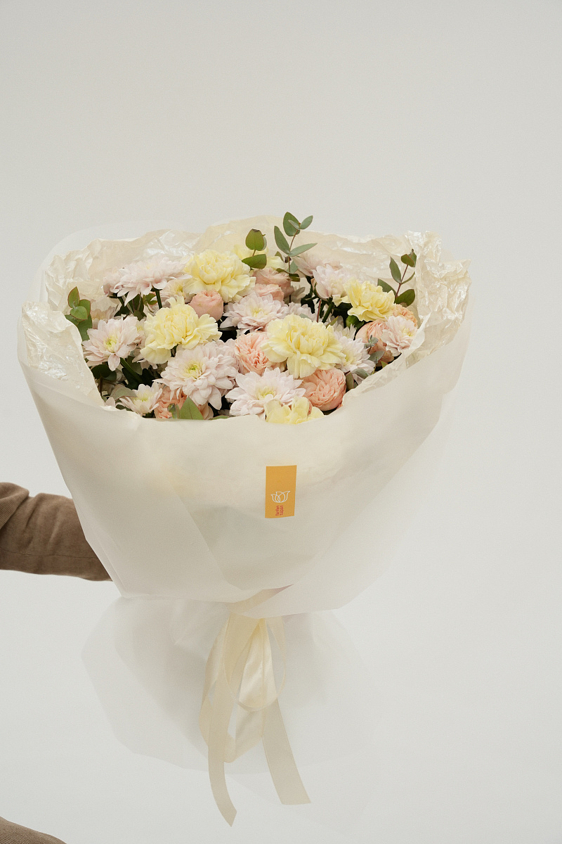 Яркий и жизнерадостный букет с лимонными гвоздиками и кустовой хризантемой заряжает позитивом и энергией солнечного дня. Лимонные гвоздики притягивают взгляды сочным желтым оттенком, ассоциирующимся с летом, теплом и счастьем. Нежная хризантема подчеркивает свежесть и легкость композиции, добавляя ей объема и шарма. Такой букет отлично поднимает настроение, напоминает о солнечных днях и становится прекрасным подарком близким людям. Подходит как для повседневных поздравлений, так и для украшения интерьера в стиле минимализма или скандинавского дизайна.