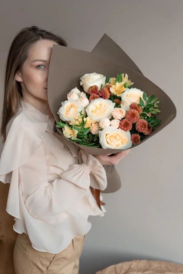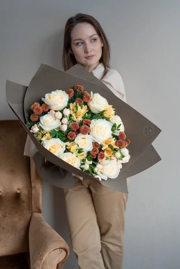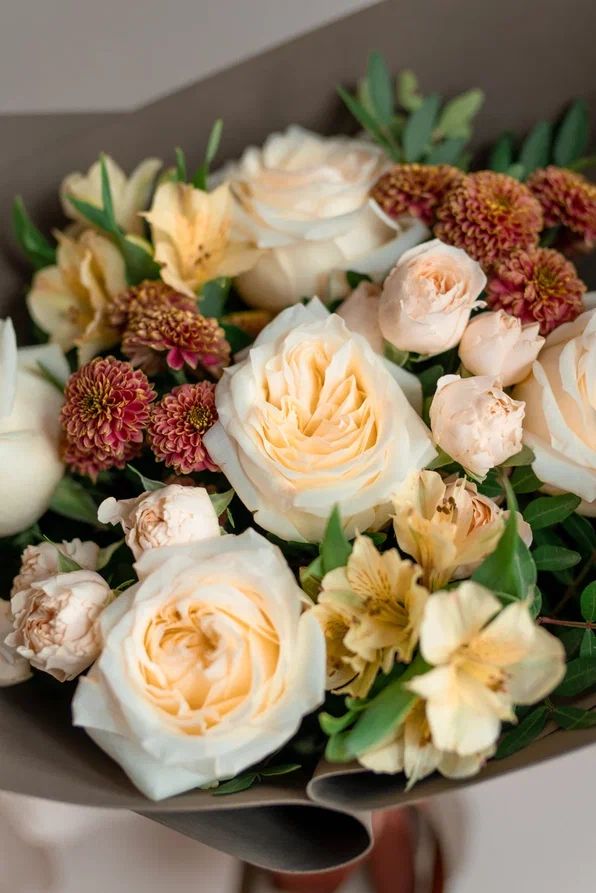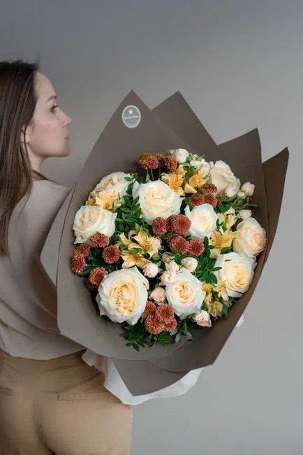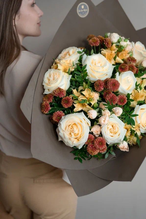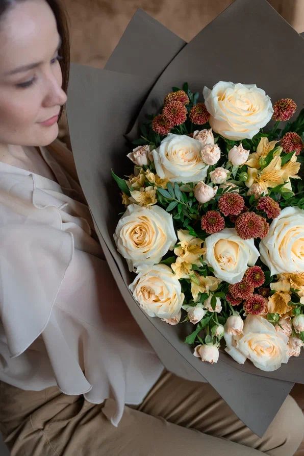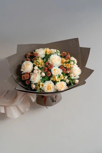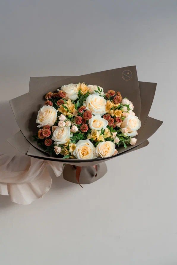 Нежные кремовые розы и искусно сложенные шоколадные сантини создают изысканное сочетание цветов и ароматов, окутывающее пространство нежностью и элегантностью. Эти прекрасные цветы, дополняющие друг друга своей красотой, способны превратить обычный момент в незабываемое впечатление.