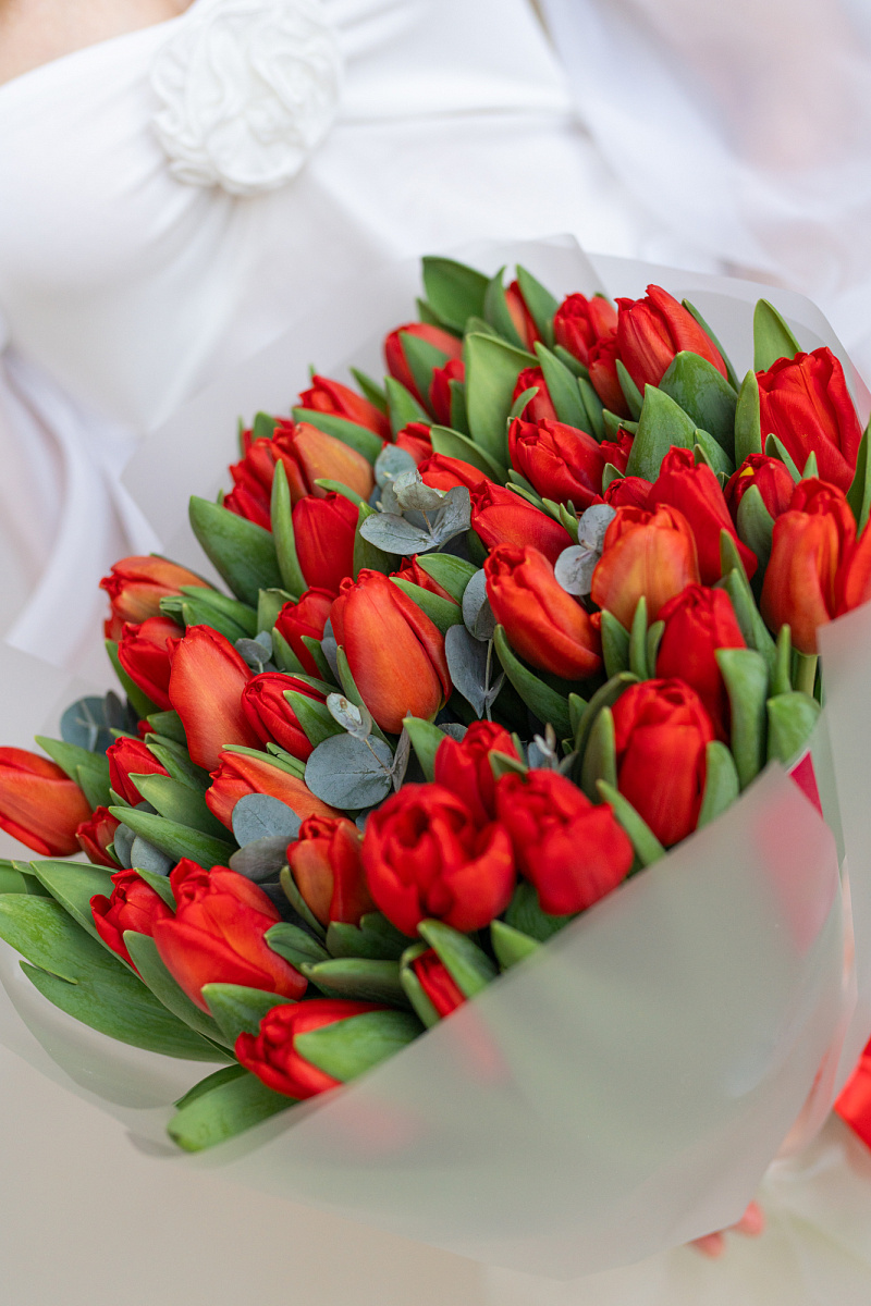 Модная комбинация: яркие красные тюльпаны и лаконичный эвкалипт. Минималистичная геометрия бутонов и мягкая фактура зелени создают актуальный визуальный дуэт. Такой букет станет выразительным акцентом в современном пространстве или стильным знаком внимания без лишних слов.