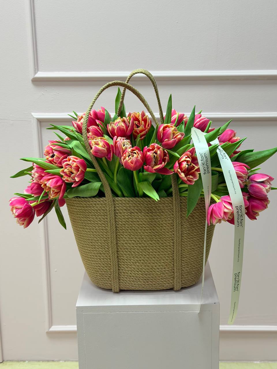Композиция выглядит свежо и жизнерадостно, идеально подойдёт для весеннего декора, подарка или украшения интерьера. Сочетание натурального кашпо и ярких тюльпанов создаёт гармоничный и стильный акцент.