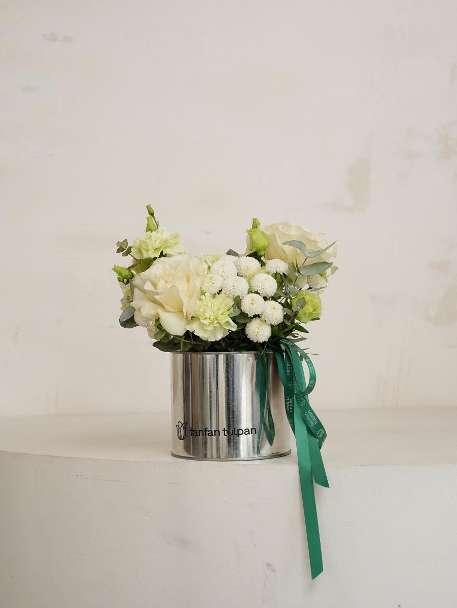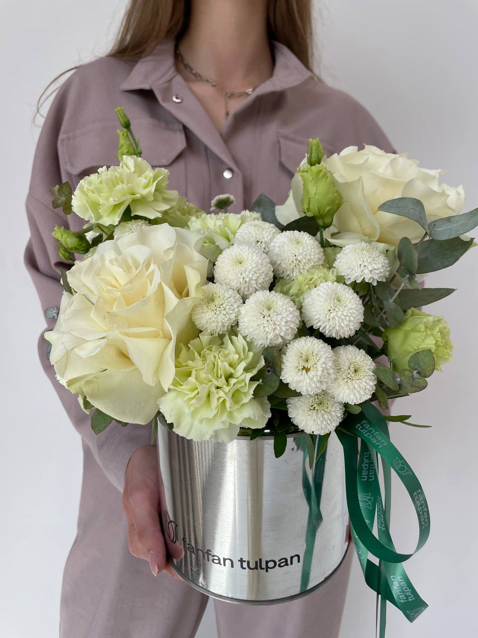 Цветочная композиция из роскошных роз и лаймовых гвоздик представляет собой удивительное сочетание элегантности и природной красоты.