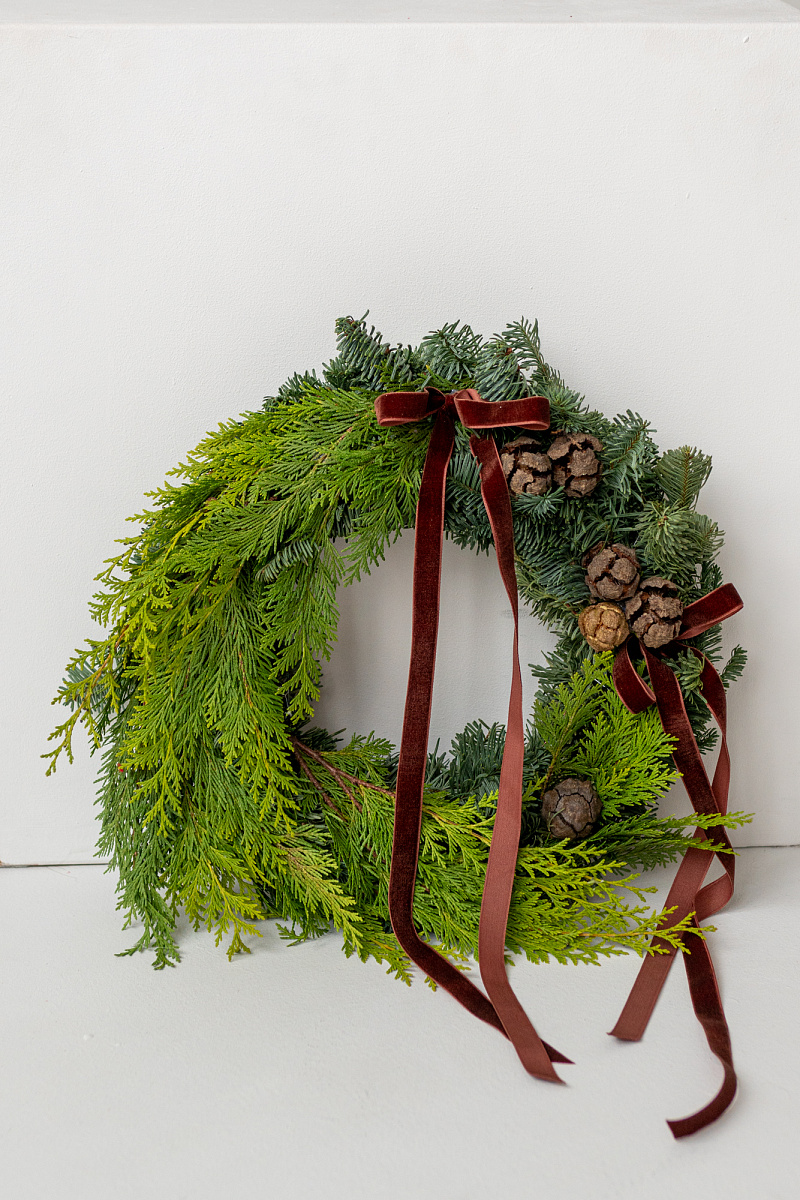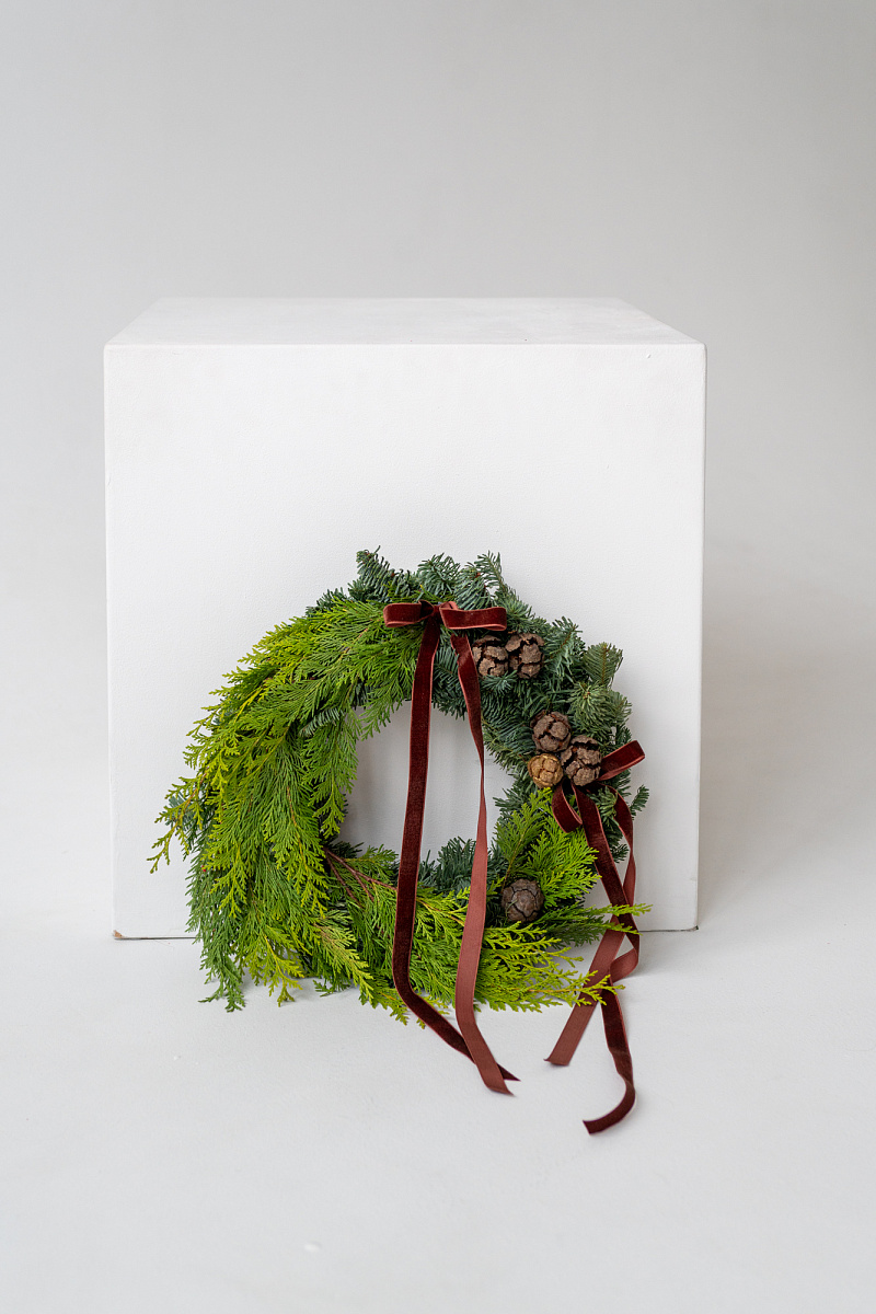 Новогодний венок из нобилиса и туи — это элегантное и ароматное украшение, которое создаёт атмосферу праздника. Нобилис (пихта) и туя — популярные хвойные растения, которые долго сохраняют свежесть и придают композиции объём и текстуру.