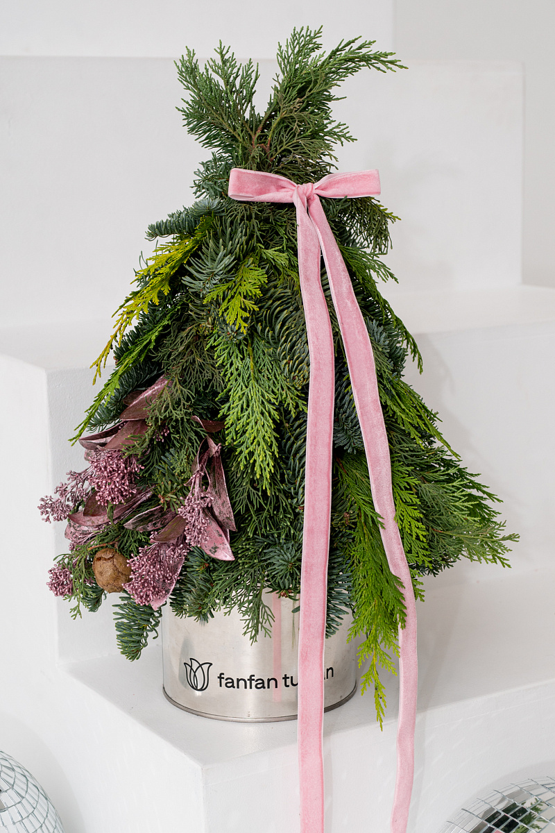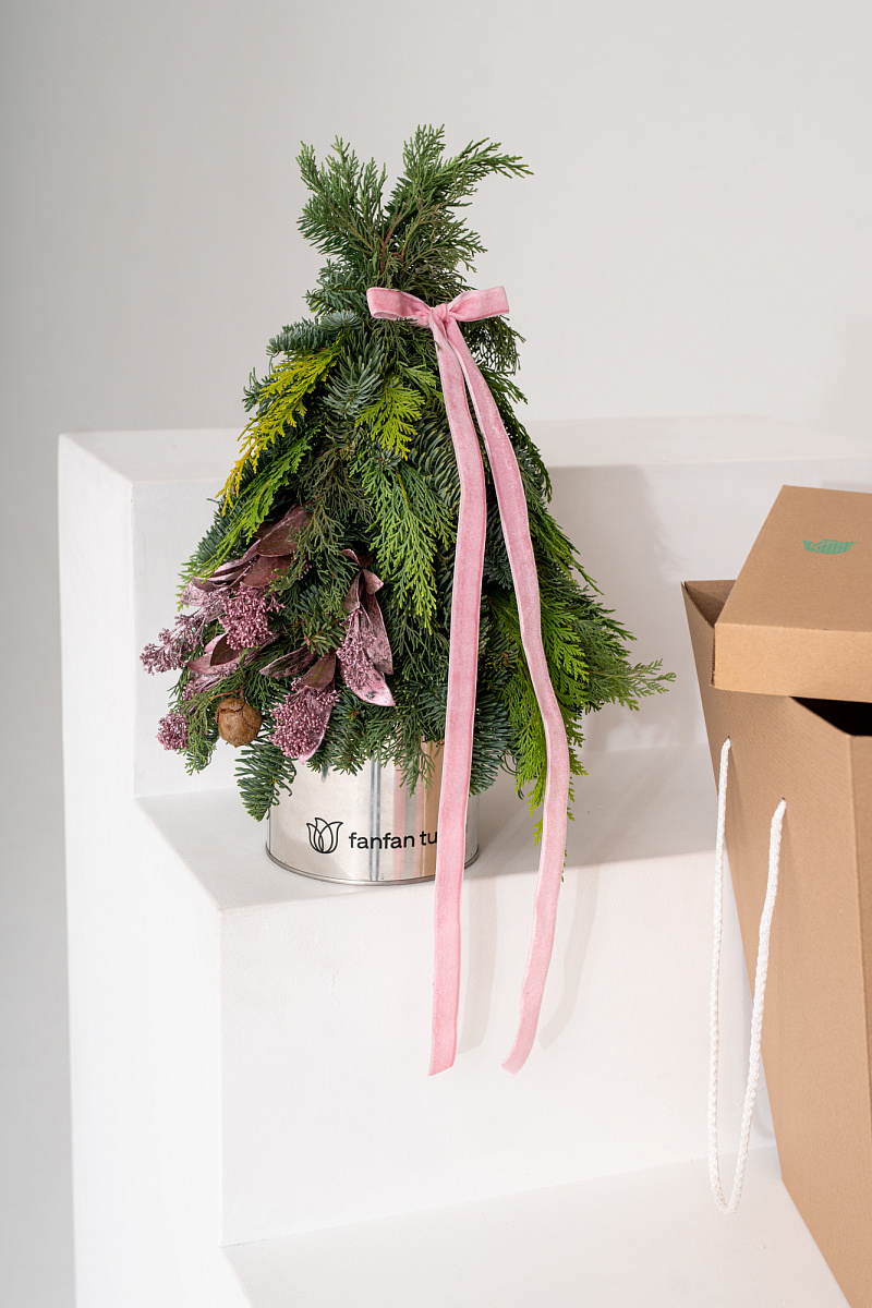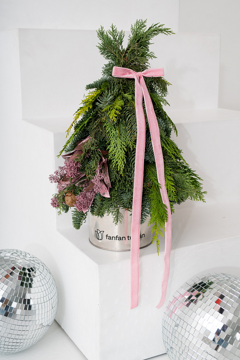 Новогодняя композиция -елочка из нобилиса и туи — это стильное и ароматное украшение, которое создаёт атмосферу праздника. Такие композиции сочетают в себе благородную хвою нобилиса и плотную структуру туи, дополненные декоративными элементами.