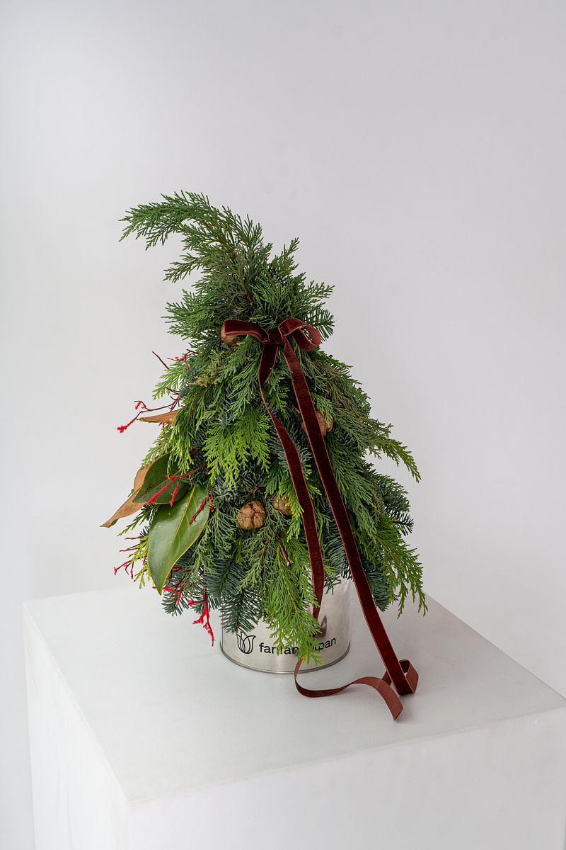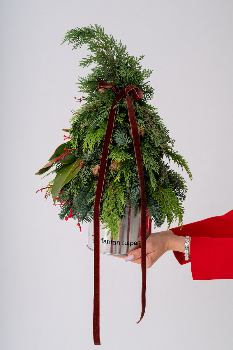 Новогодняя композиция - елочка из нобилиса и туи — это стильное и ароматное украшение, которое создаёт атмосферу праздника. Такие композиции сочетают в себе благородную хвою нобилиса и плотную структуру туи, дополненные декоративными элементами.