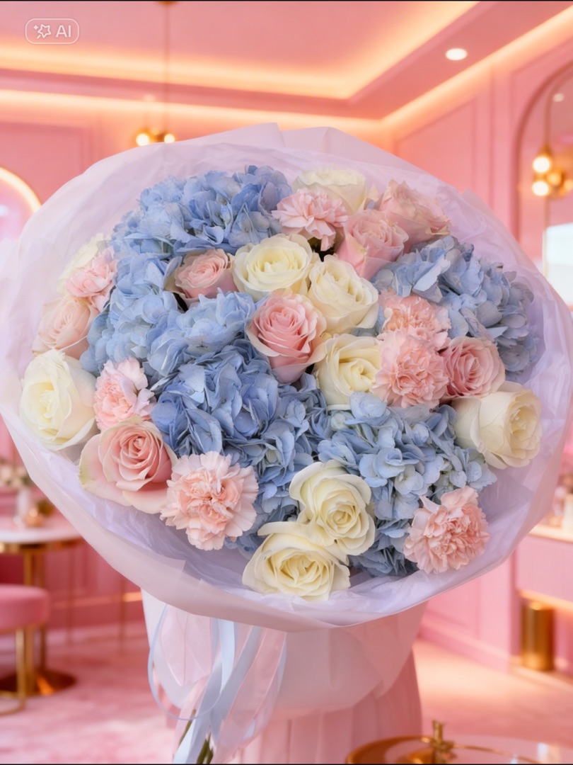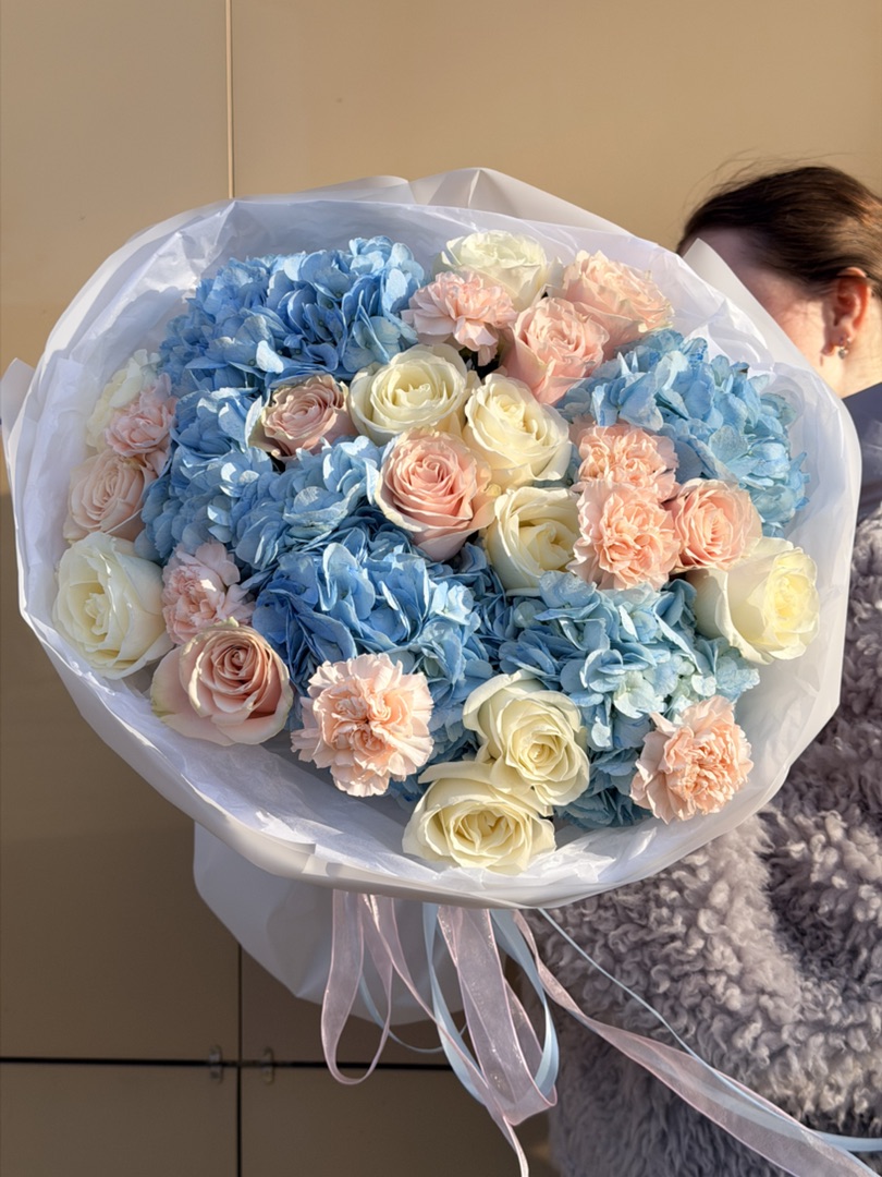 Объёмная композиция создаёт ощущение лёгкости и невесомости: гортензии будто парят в пространстве, даря чувство умиротворения. Голубой цвет символизирует чистоту, верность и безмятежность — этот букет станет молчаливым обещанием надёжности и искренних чувств. Подарите частичку неба тому, кто дорог!